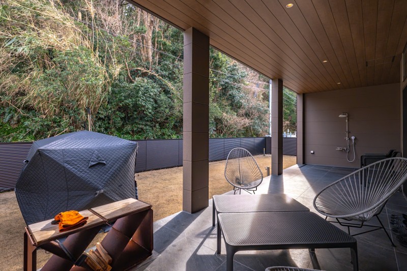 C棟・D棟には、テントサウナ(オプション)を備え、温泉露天風呂や海辺のプライベート空間で、心も体もリラックス。